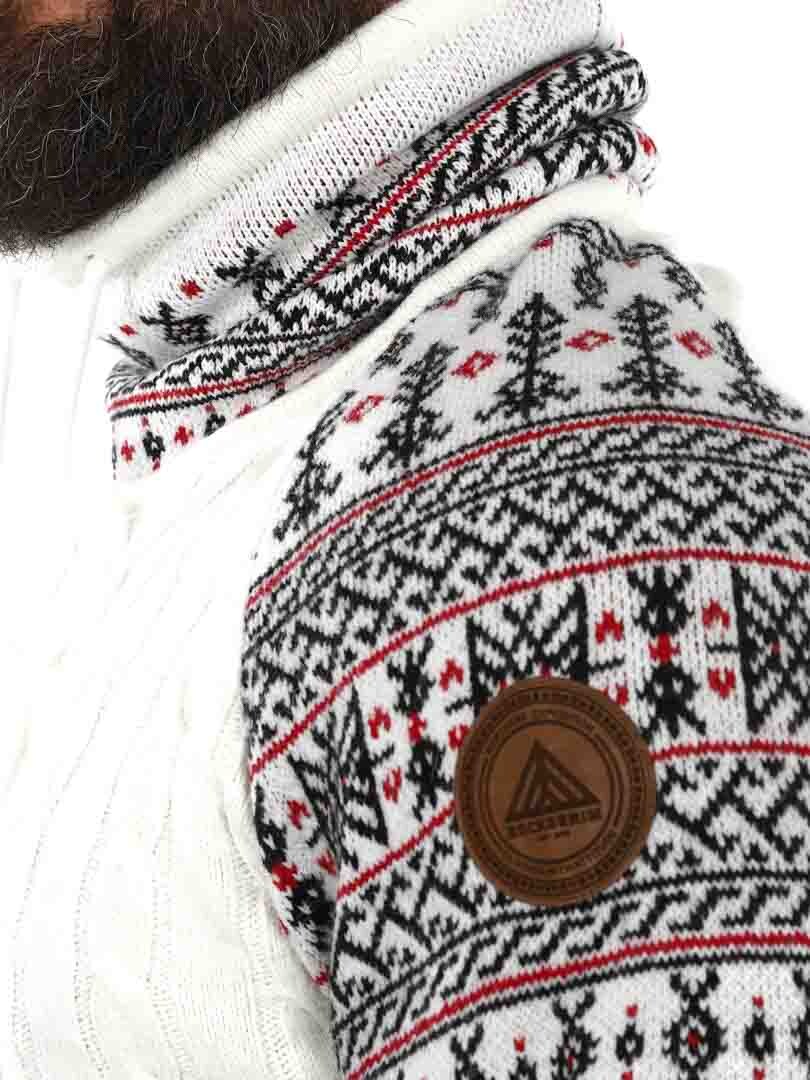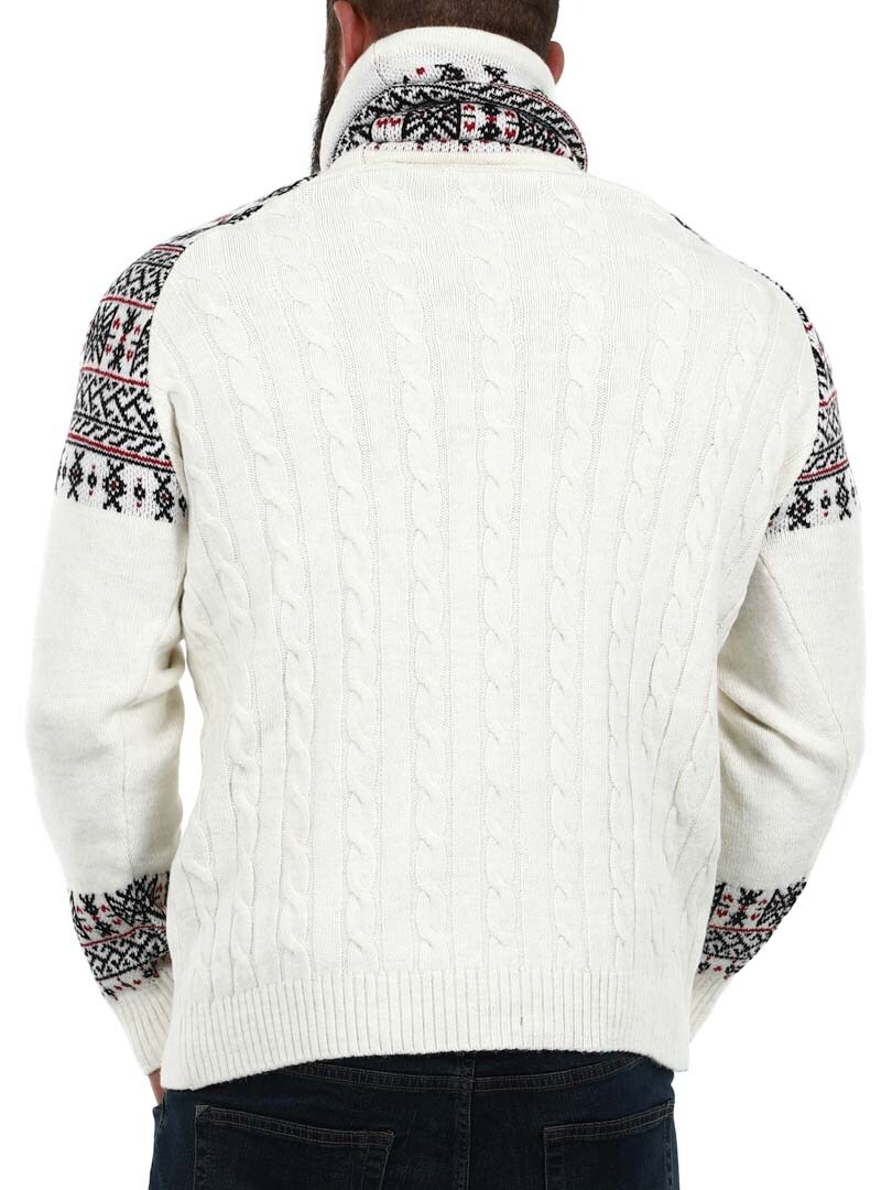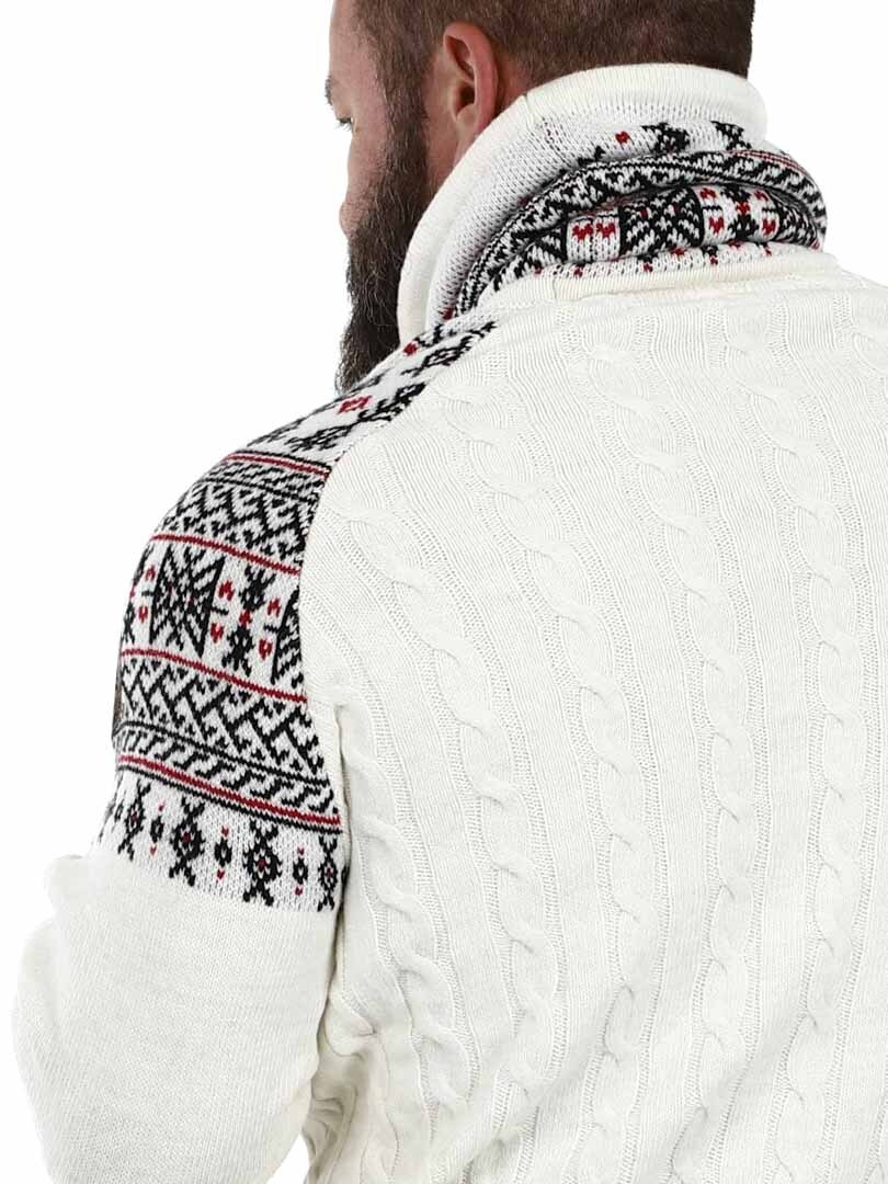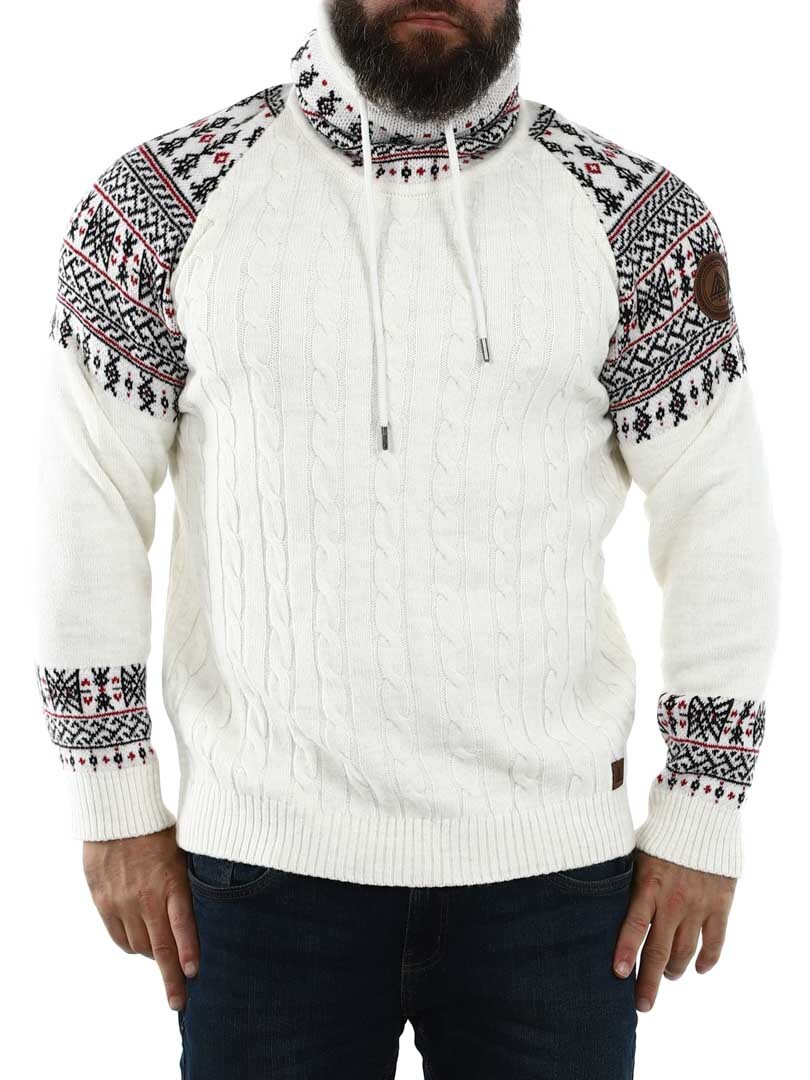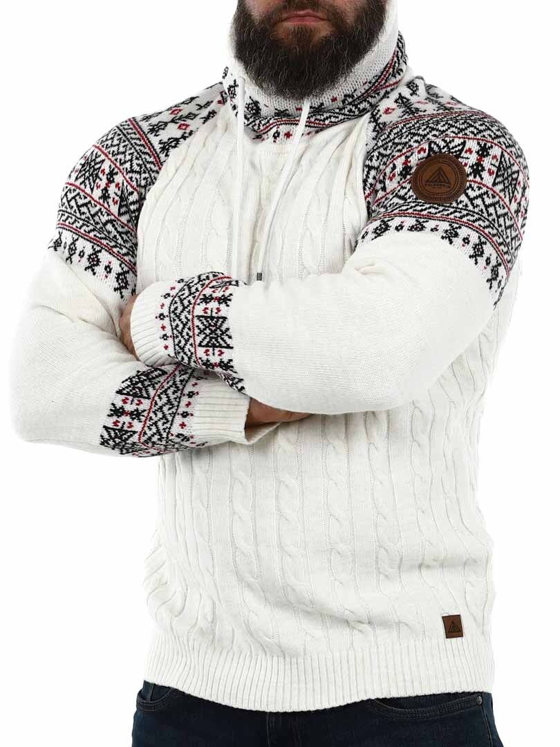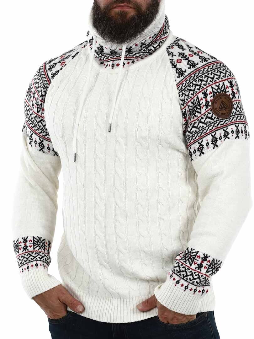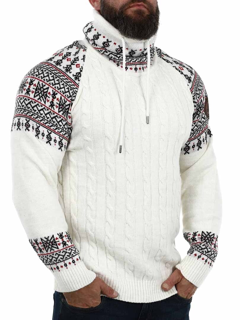 Kabelstrikket trøje. Den er designet med en høj hals, der kan reguleres ved hjælp af en snøre. Ærmer og hals fremhæves med et flot mønster i kontrastfarver. Denne trøje er særligt fremstillet til vores kunder og findes kun hos RockDenim!