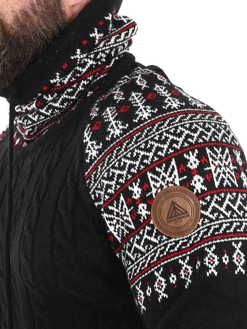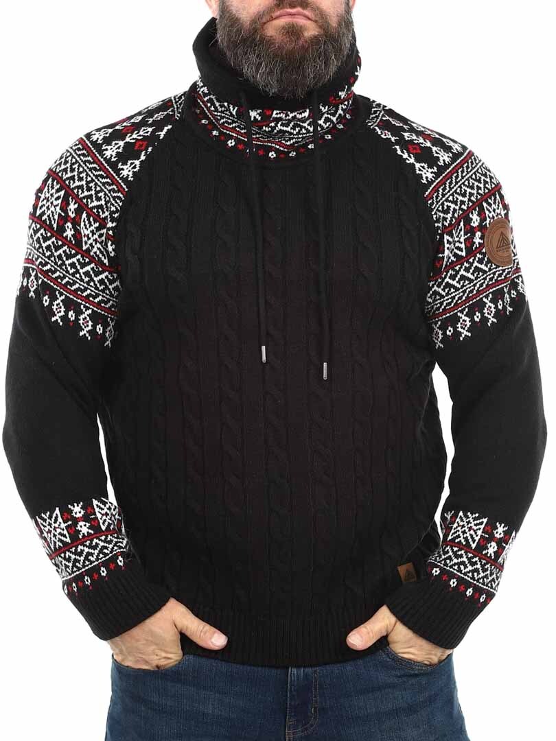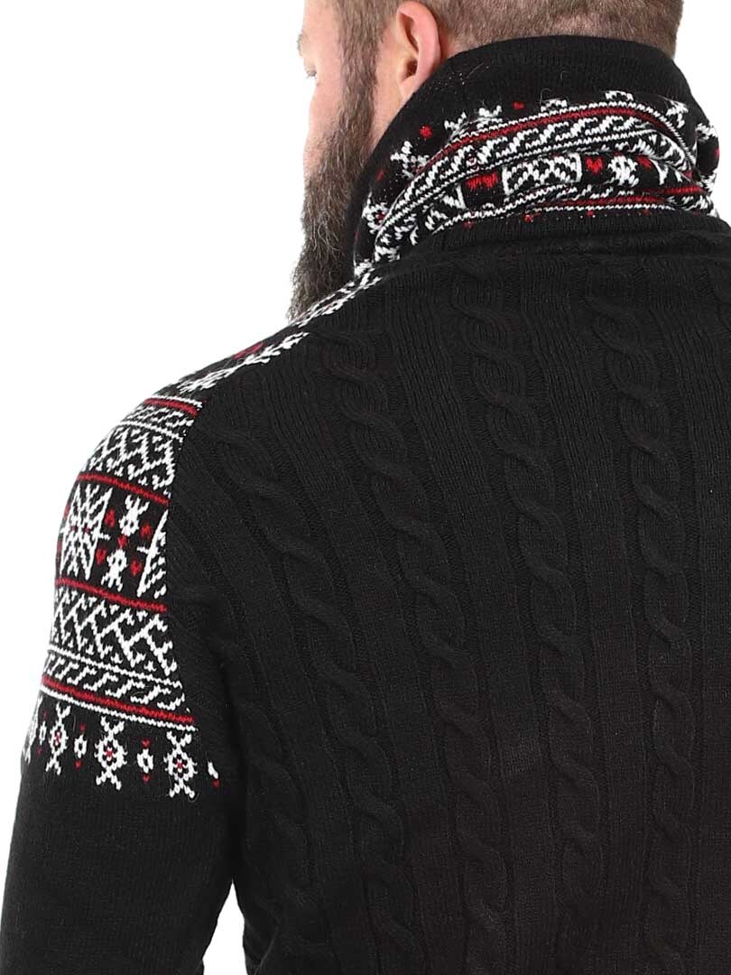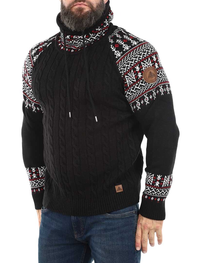 Kabelstrikket trøje. Den er designet med en høj hals, der kan reguleres ved hjælp af en snøre. Ærmer og hals fremhæves med et flot mønster i kontrastfarver. Denne trøje er særligt fremstillet til vores kunder og findes kun hos RockDenim!