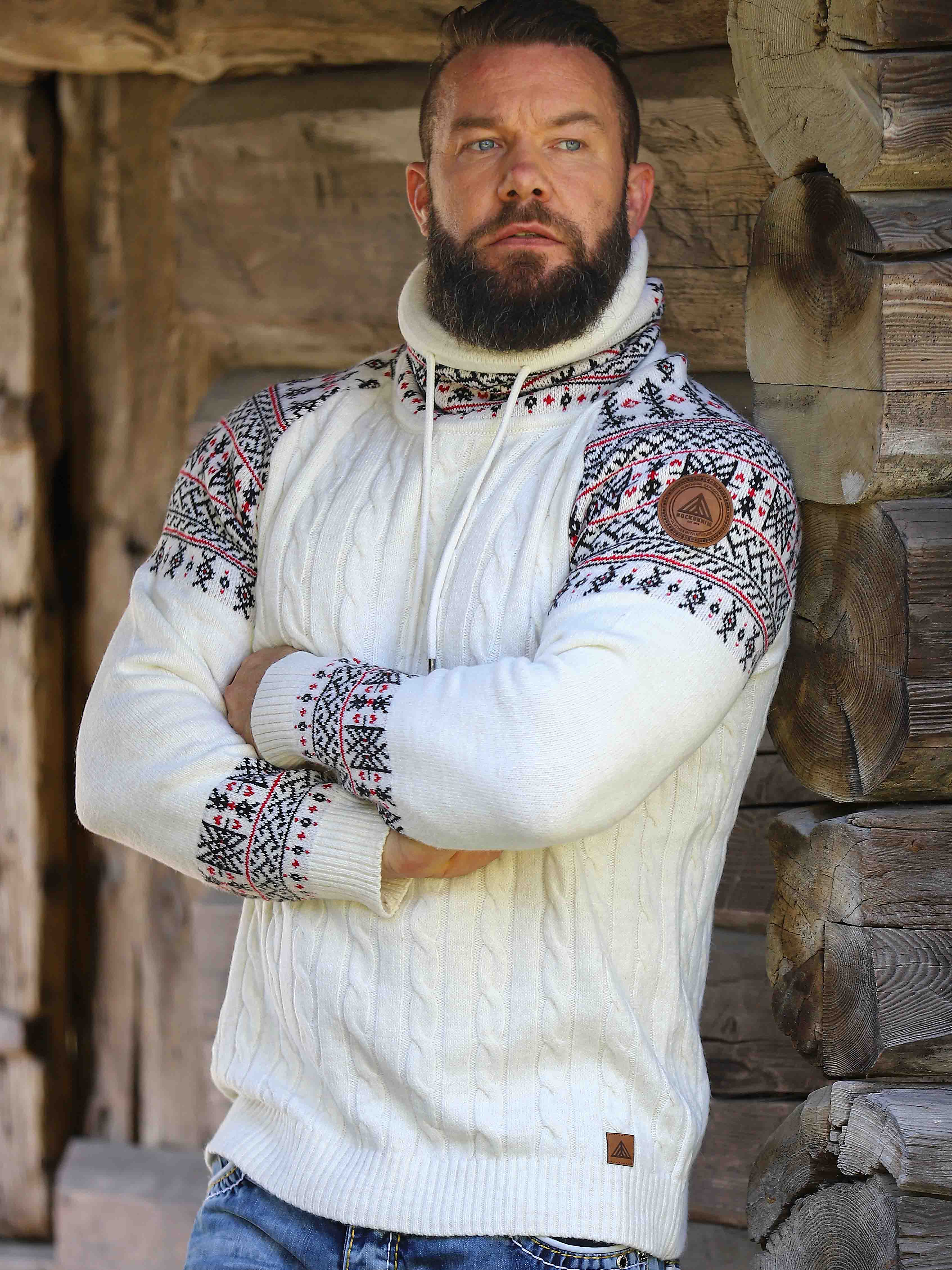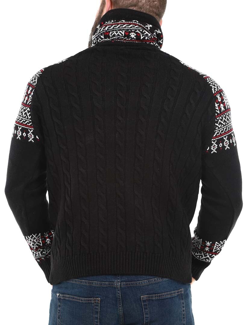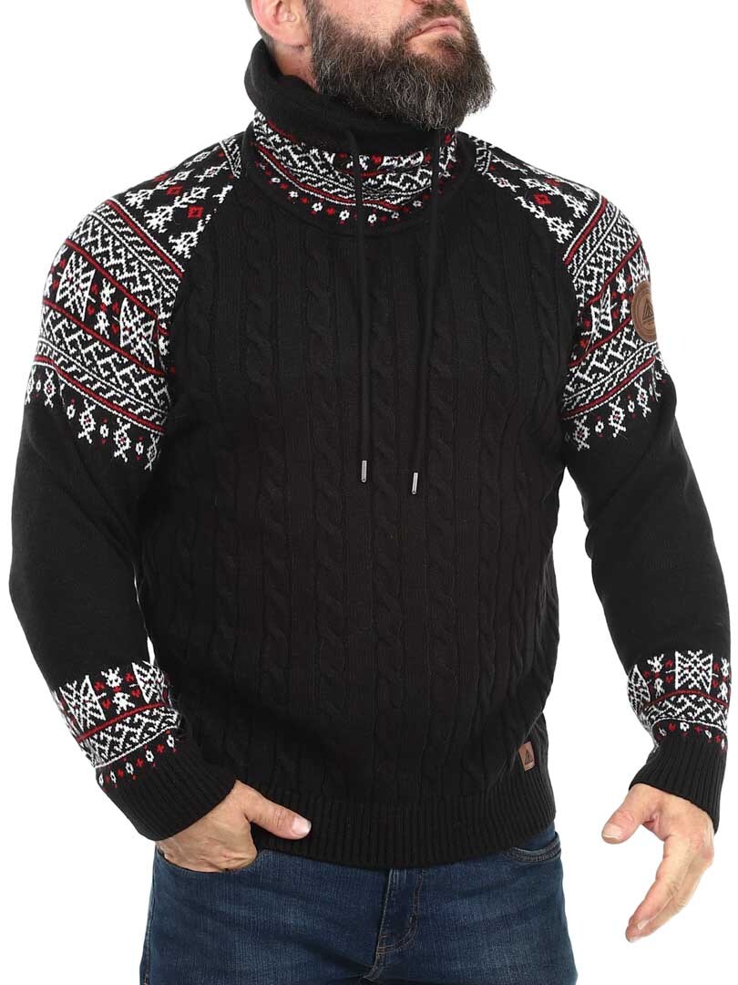 Kabelstrikket trøje. Den er designet med en høj hals, der kan reguleres ved hjælp af en snøre. Ærmer og hals fremhæves med et flot mønster i kontrastfarver. Denne trøje er særligt fremstillet til vores kunder og findes kun hos RockDenim!