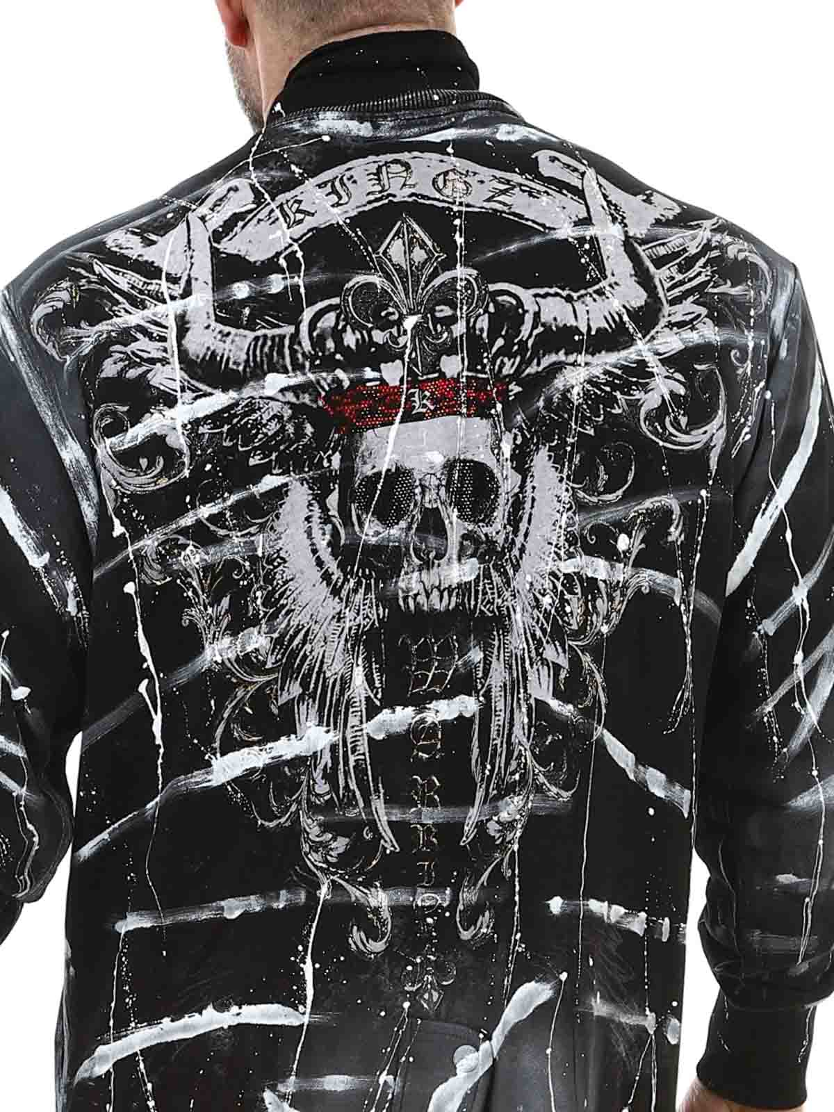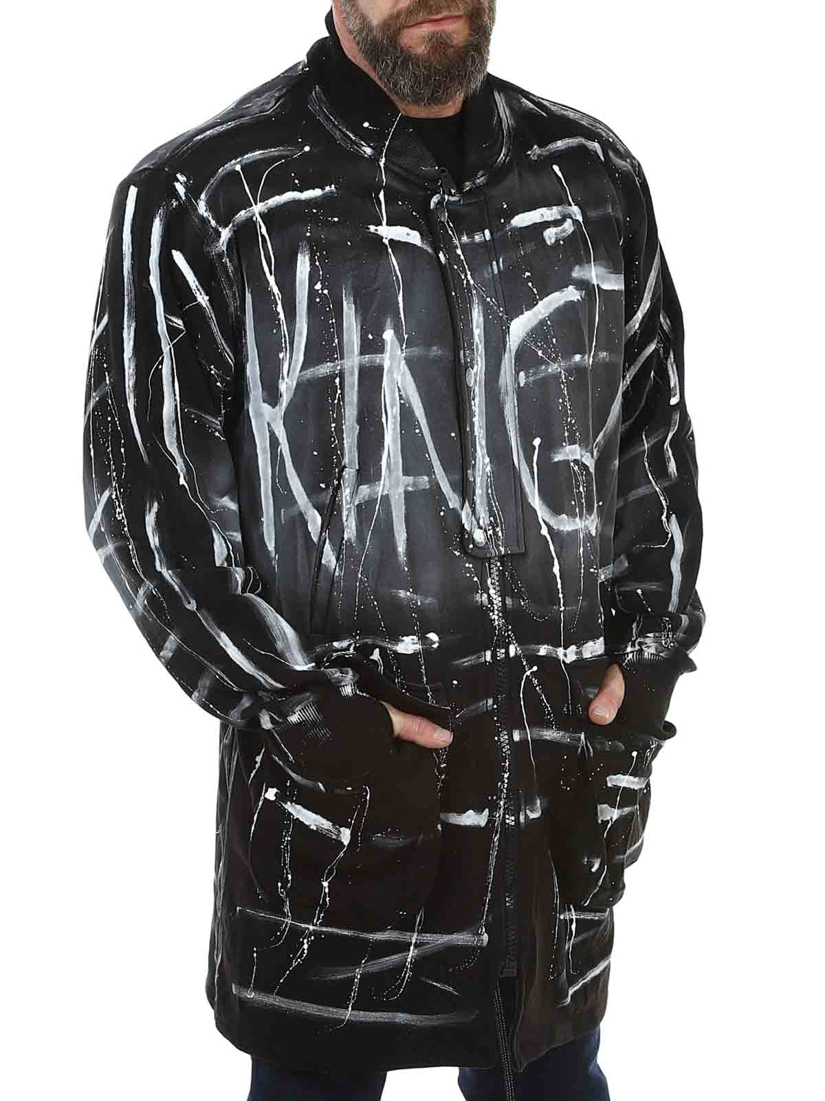 En lang trøje med attitude og et design, der virkelig skiller sig ud. Detaljeret med malede farveeffekter og stænk, som giver et råt og kunstnerisk look, mens ryggen prydes af et dødningehoved med strasssten som en ekstra iøjnefaldende detalje. Trøjen har fire forlommer og lukkes med både lynlås og knapper.