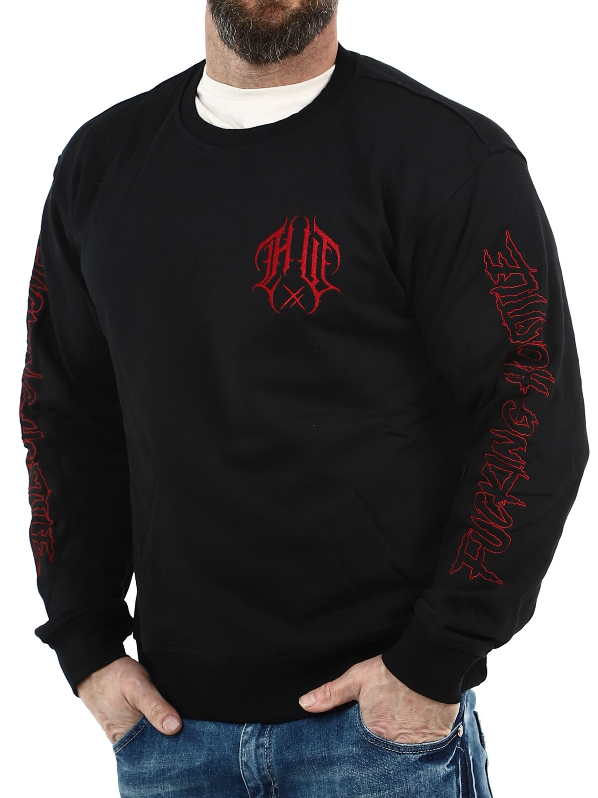 Sort trøje designet med rødt broderet tryk på brystet, ryggen og ærmerne. Den har rund halsudskæring og ribkanter i afslutningerne. En fed sweatshirt, der passer lige så godt til hverdagsbrug som til et mere alternativt streetwear-look.