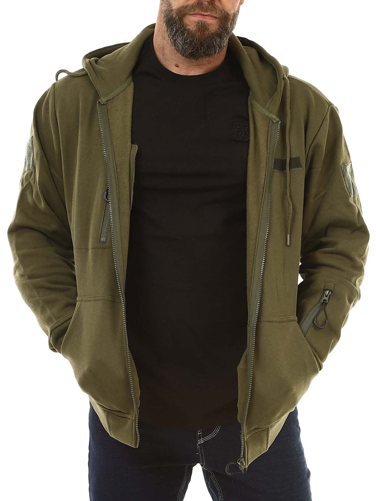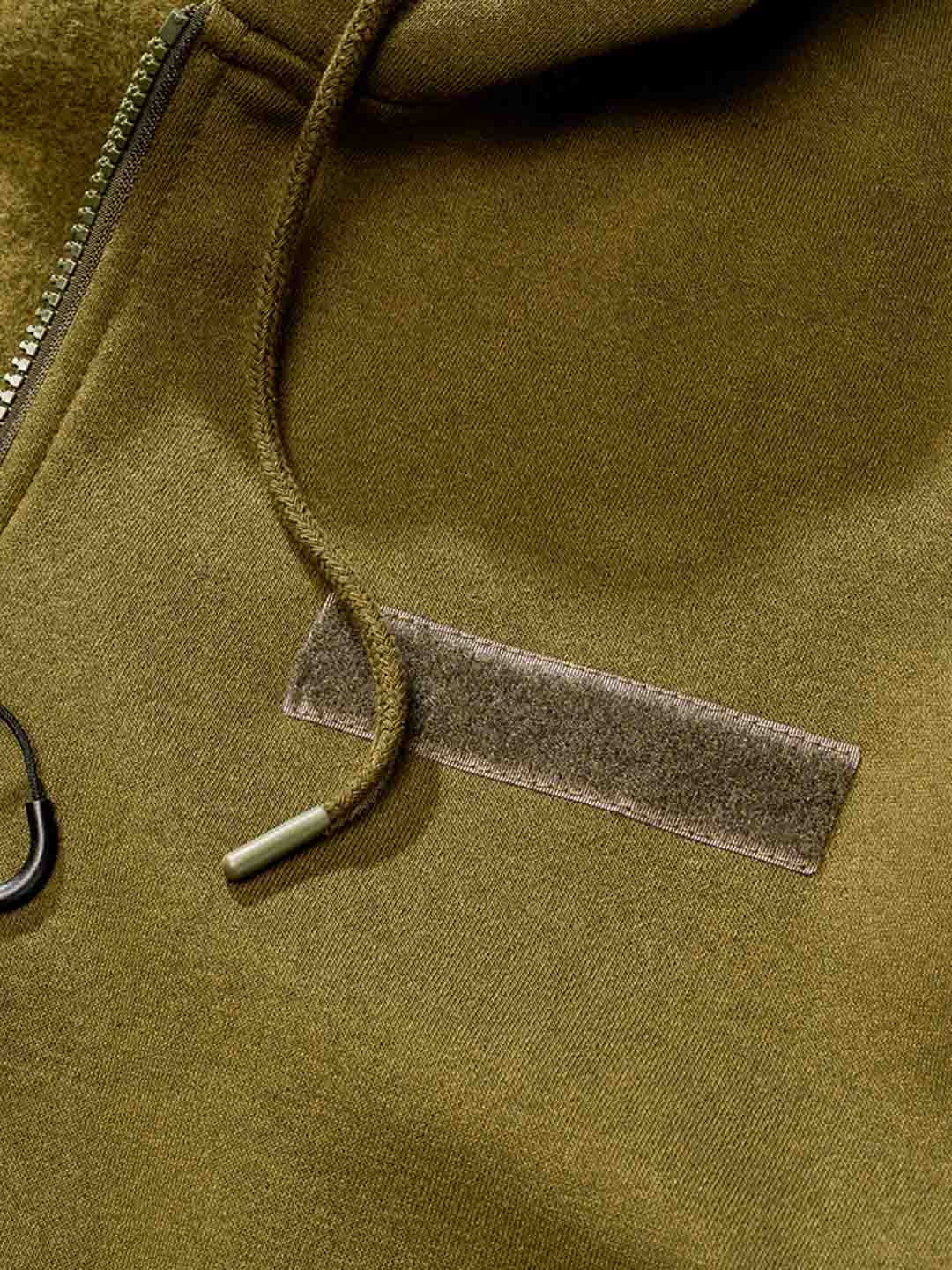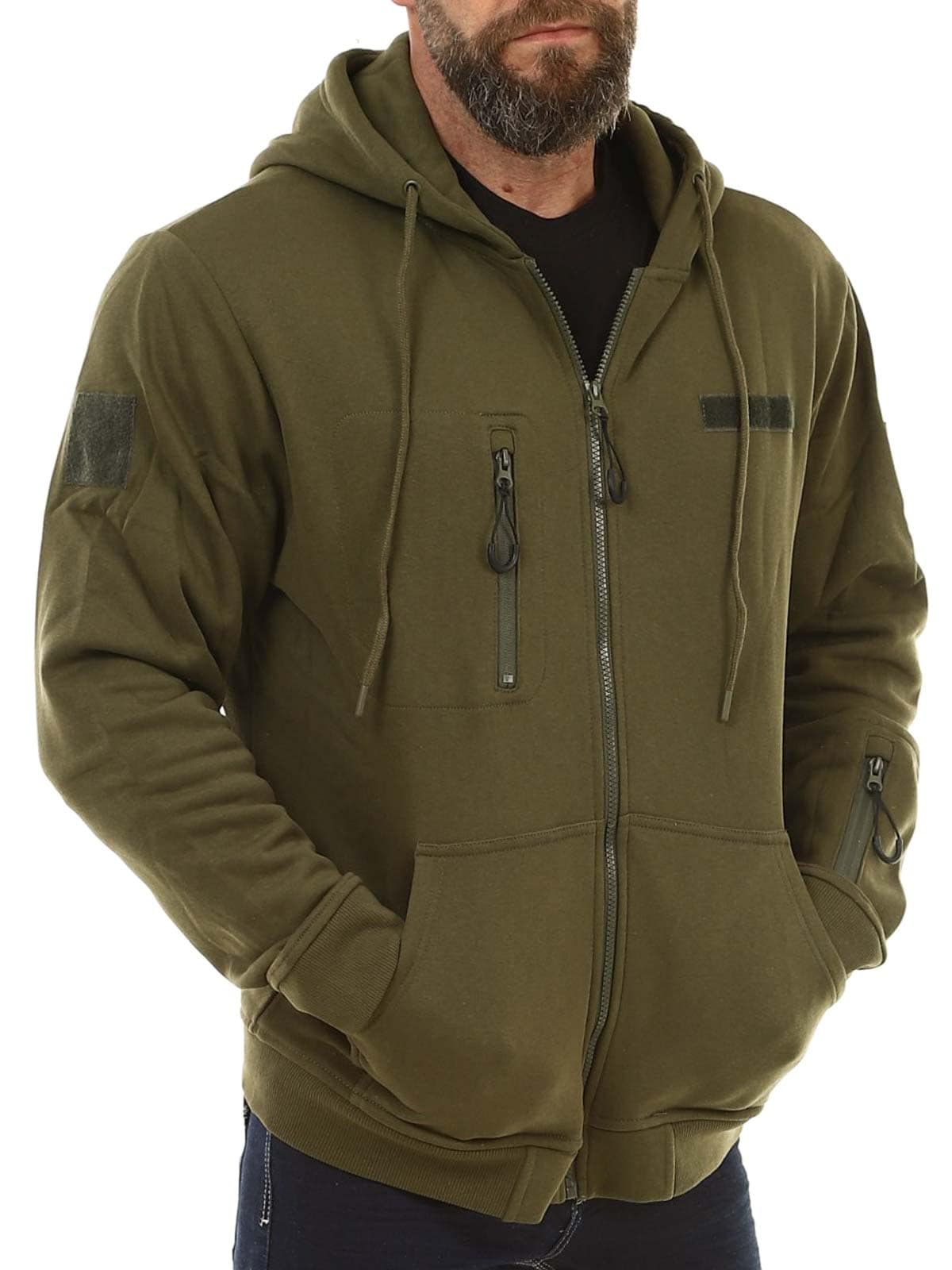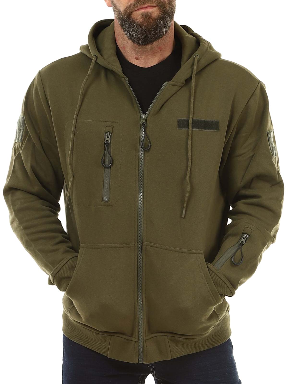 Praktisk hættetrøje i en mørkere grøn farve. Trøjen har lynlås foran og en justerbar hætte med snøre. Den er udstyret med en brystlomme, en lomme på armen samt to lommer foran. Ribkanter ved ærmerne og nederkanten giver en behagelig pasform, mens den børstede inderside gør trøjen blød og varm at have på.