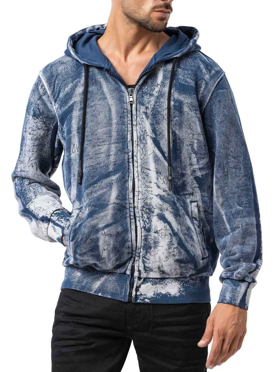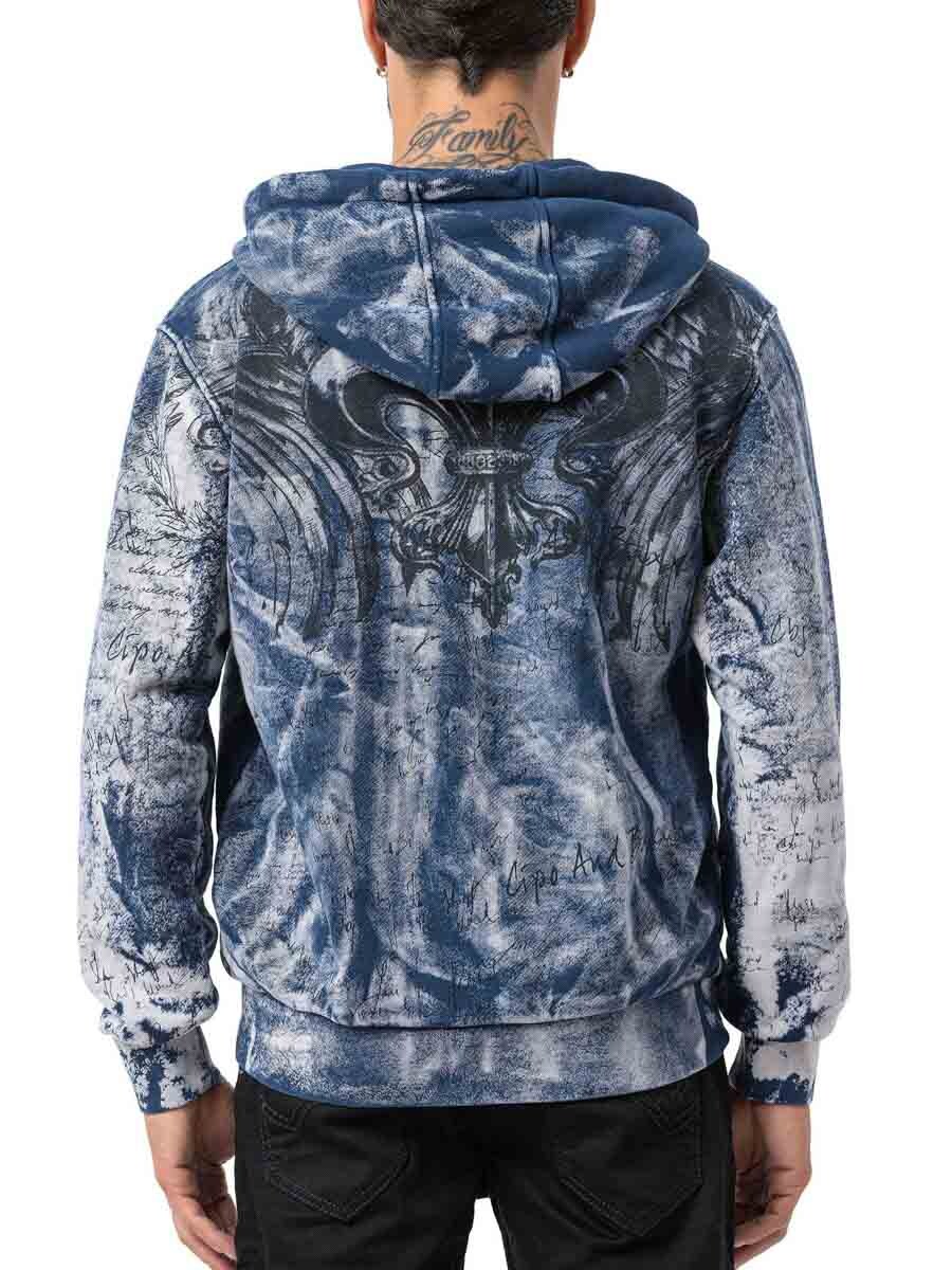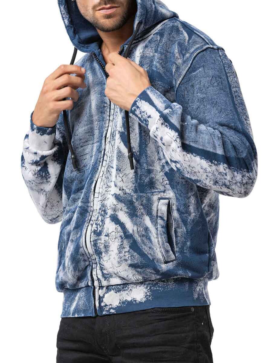 Mørk trøje med lysere partier skabt gennem et tie-dye-inspireret vaske- og printmønster, som giver tøjet et levende og let slidt udtryk. Den har hætte med snøre, to åbne lommer på maven og ribkanter ved afslutningerne. Fremstillet i 100 % bomuld.