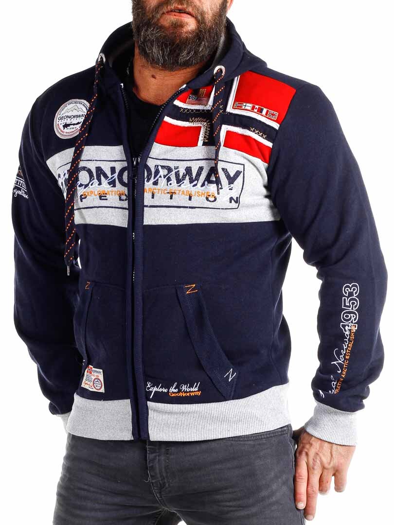 Trøjen har en rummelig hætte, lynlås som går hele vejen ned og store lommmer på maven. Mærkets logo og mønster ses både fortil og bagpå, og den har en grå ribkant forneden og ved ærmernes slutning.