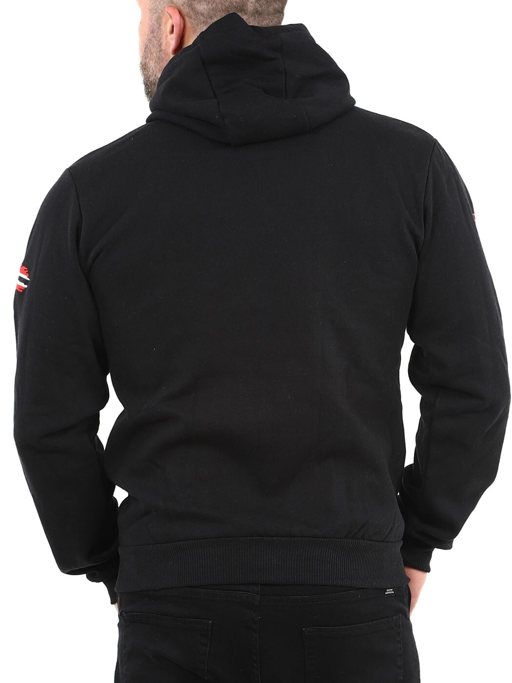 Denne hættetrøje med lynlås har et klassisk design, justerbar hætte med snøre og ribbede kanter for en behagelig pasform. Designet med flagtryk og logo på bryst og arm. Den har en børstet inderside og to åbne lommer på maven.