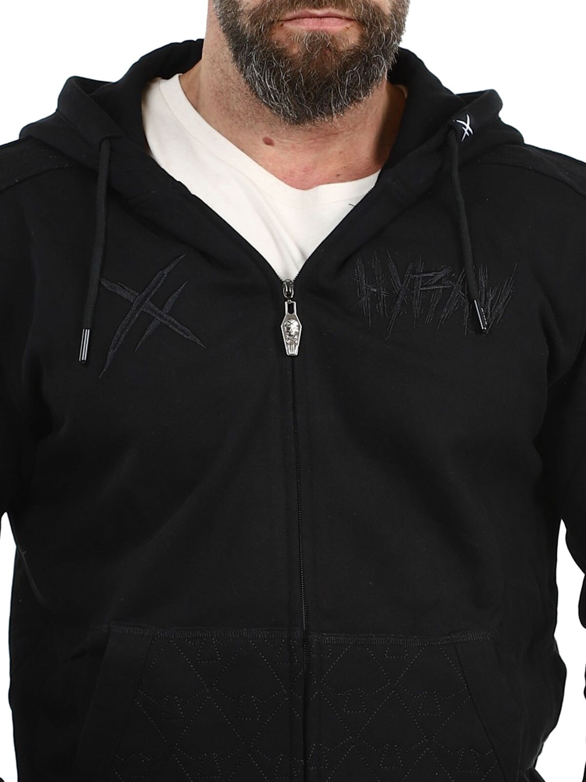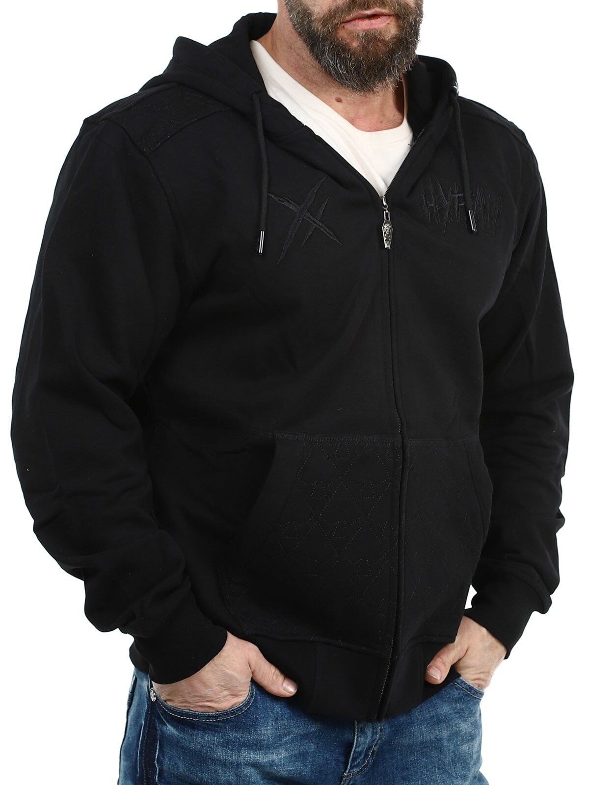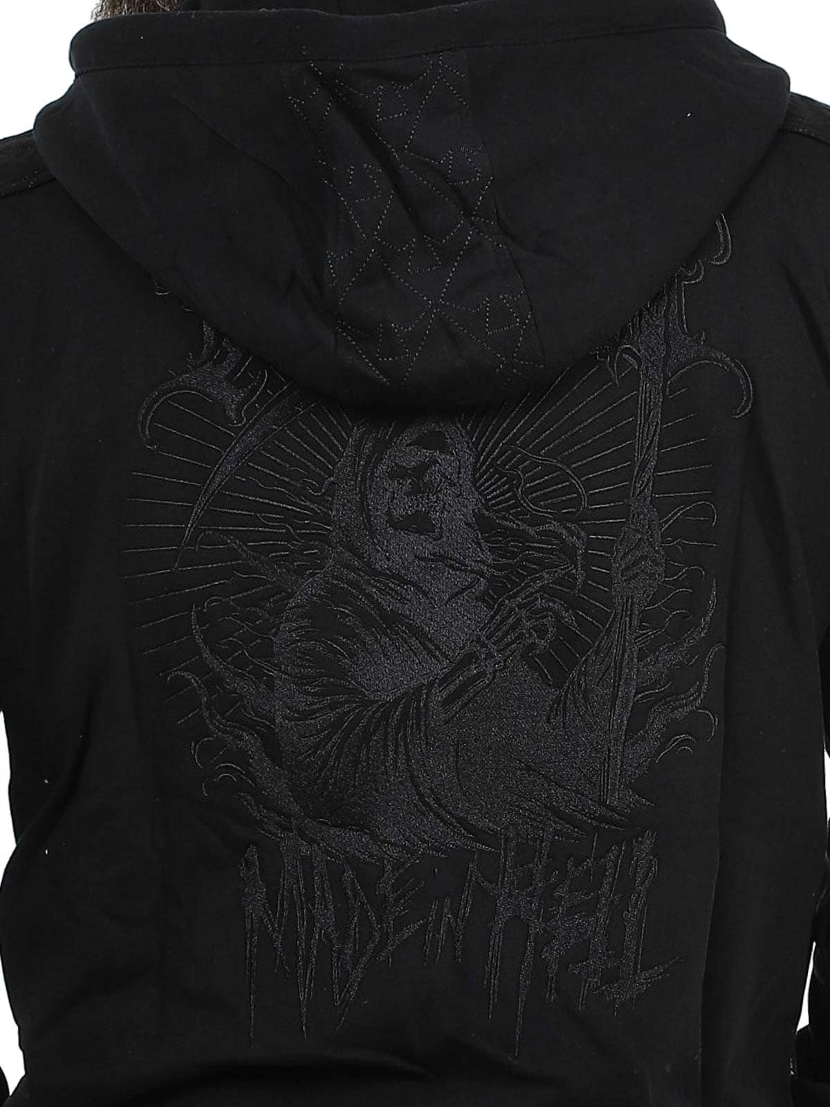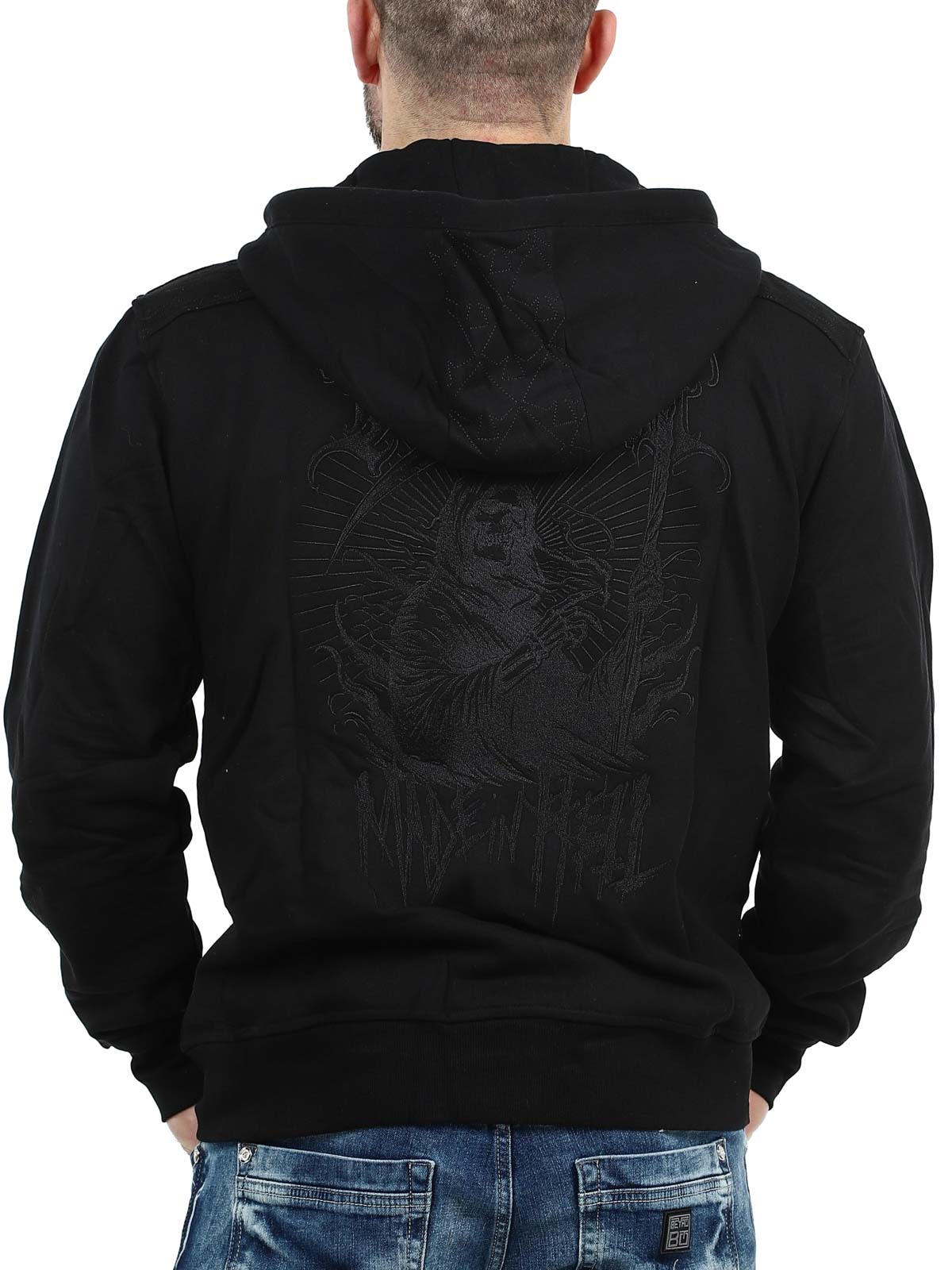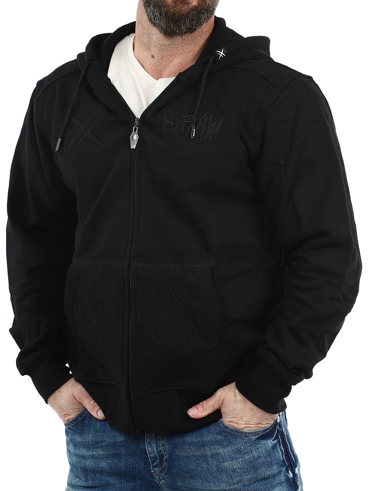 Sort trøje der er designet med et fastsyet tryk. Den har en ribbet kant for enden, to åbne lommer på maven og den lukkes ved hjælp af en lynlås.