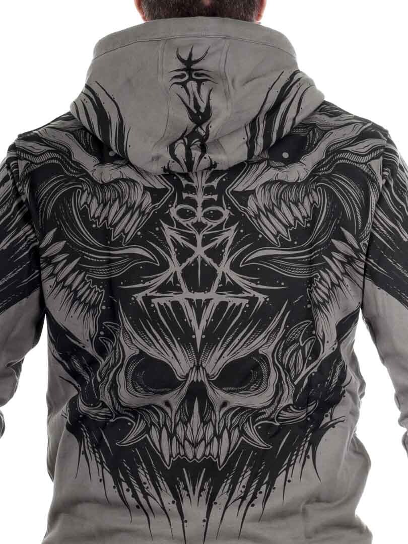 Grå hættetrøje designet med et sort mønster, der dækker både for- og bagside. Foran har den to åbne lommer, og ærme- og nederste kanter er afsluttet med ribbede manchetter. Perfekt til dig, der vil kombinere hverdagsfunktion med Hyraws rå og grafiske udtryk.