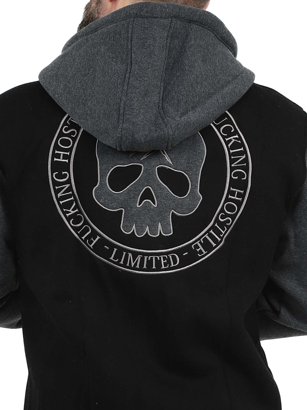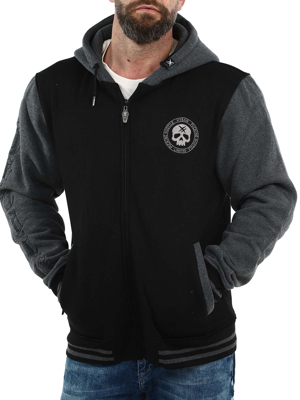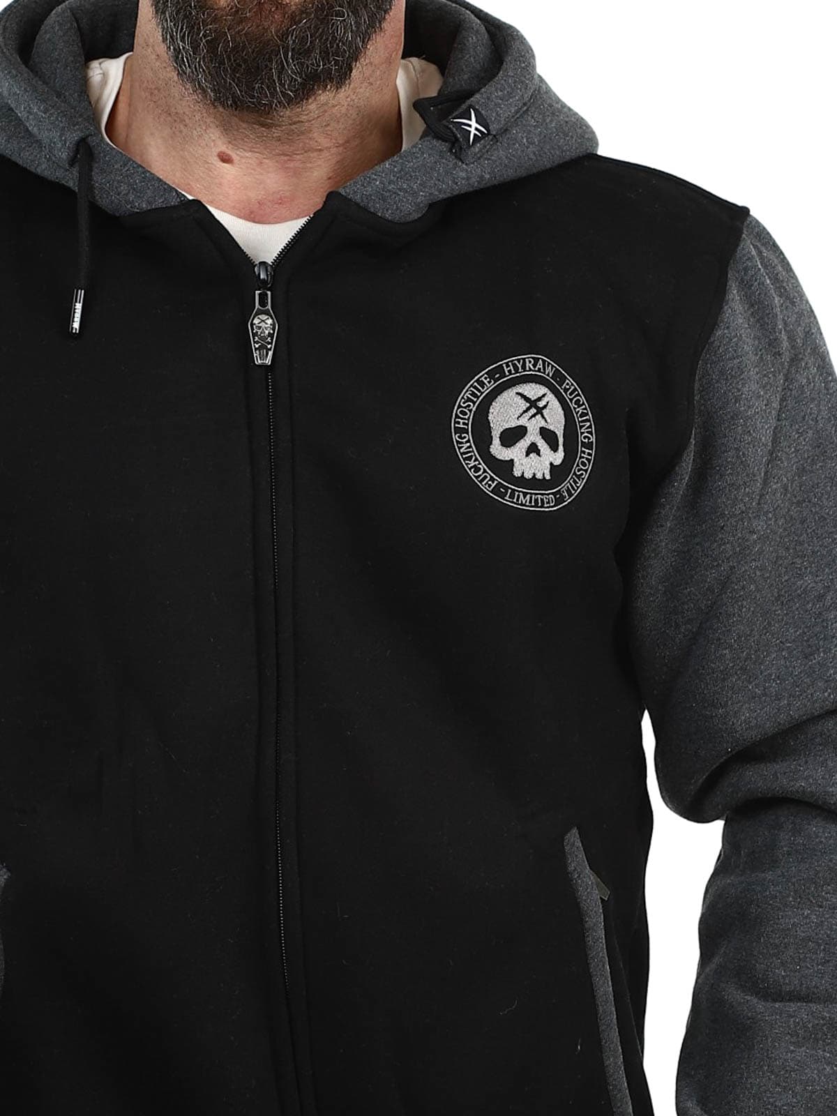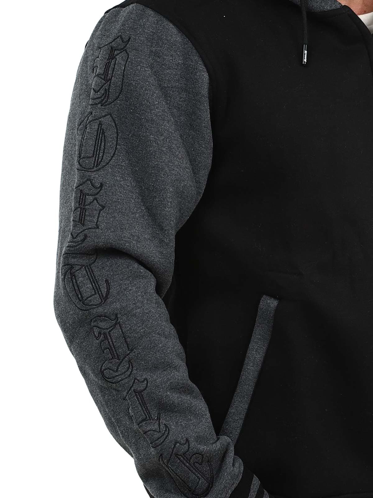 Sort trøje med mørkegrå hætte og ærmer. Designet med broderet tryk på brystet, ryggen og ærmerne. Den har børstet inderside, to lommer med lynlås samt ribkanter ved ærmer og nederkant.
