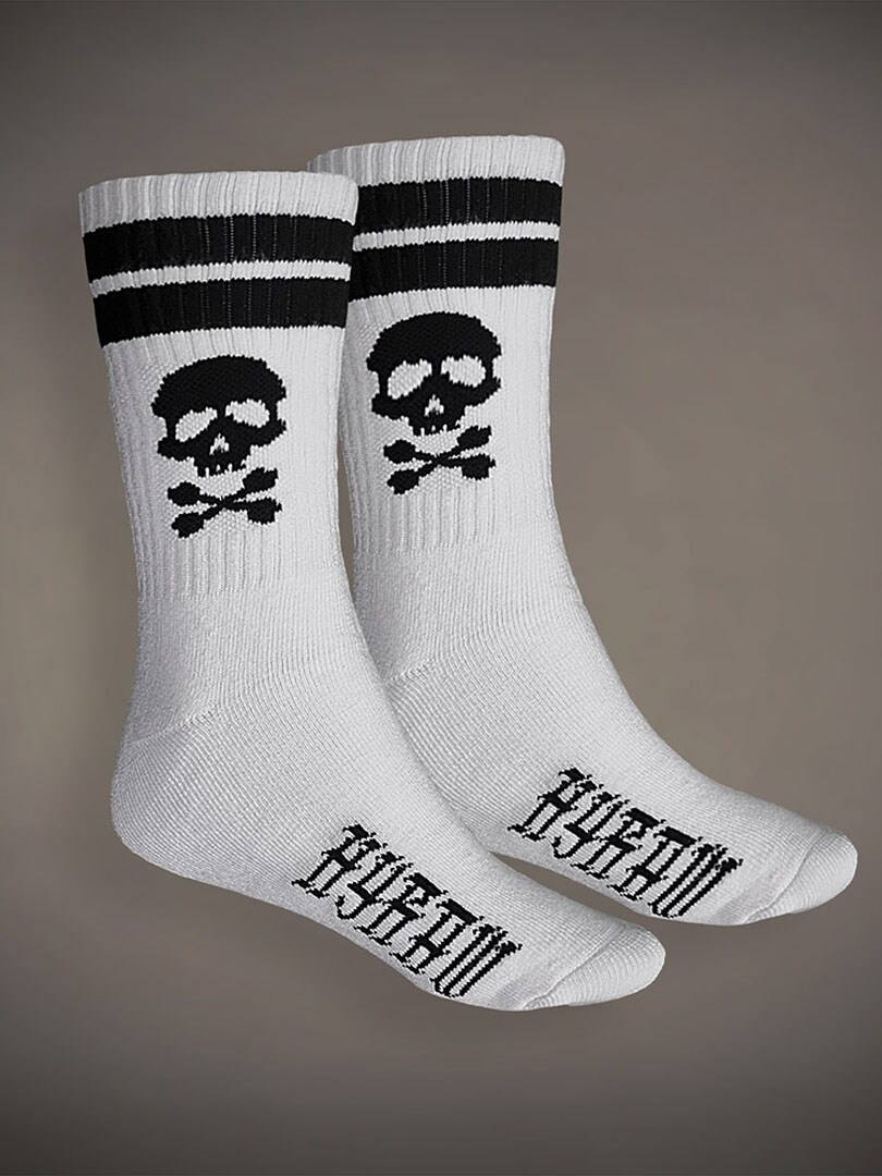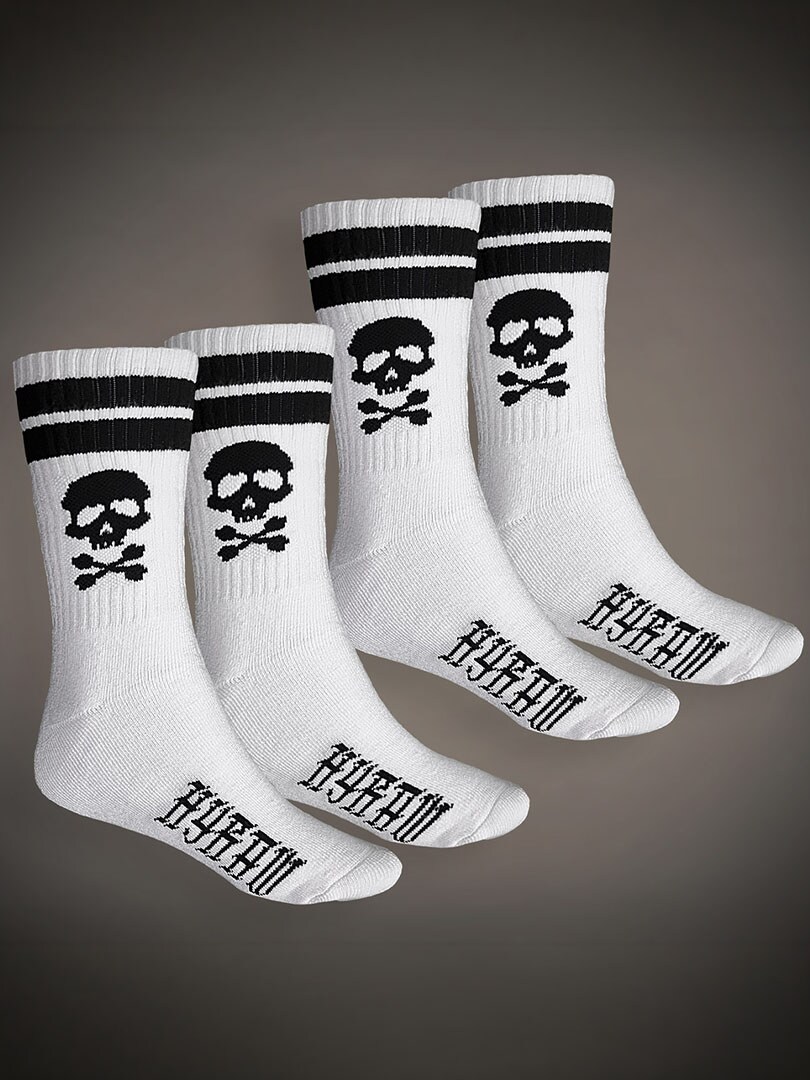 Behagelige strømper med sort dødningehovedmotiv, logo og striber. Ribkant øverst.