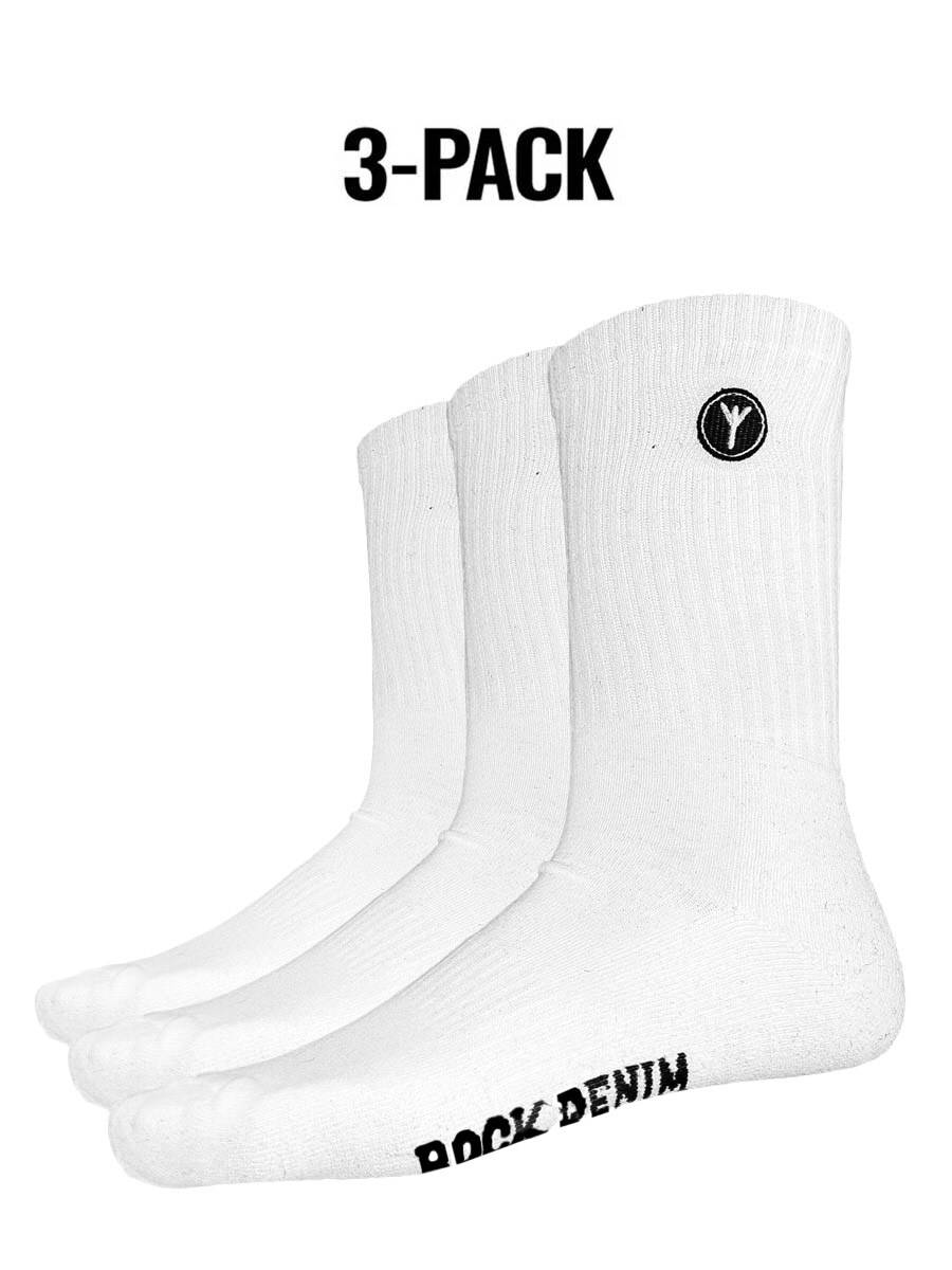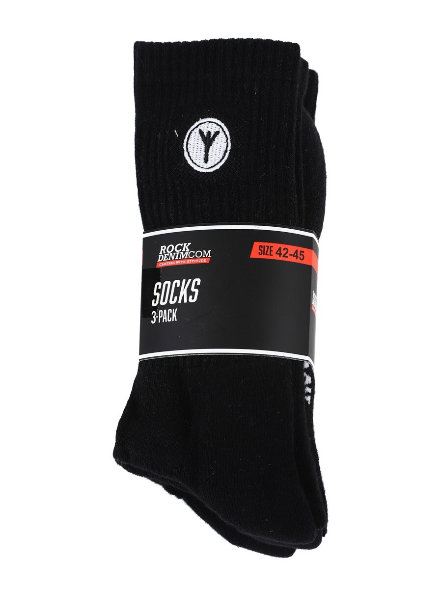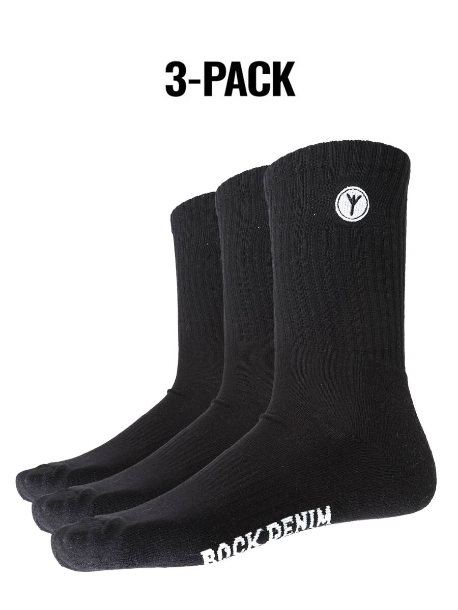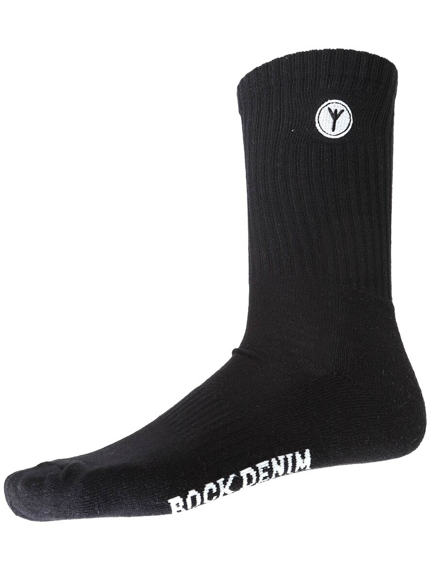 Sorte sokker med et fastsyet tryk i hvid. Perfekt til hverdagsbrug eller træning. Ribbet skaft, der giver en god pasform og et sporty look. ""RockDenim"" med små sorte bogstaver under foden.
