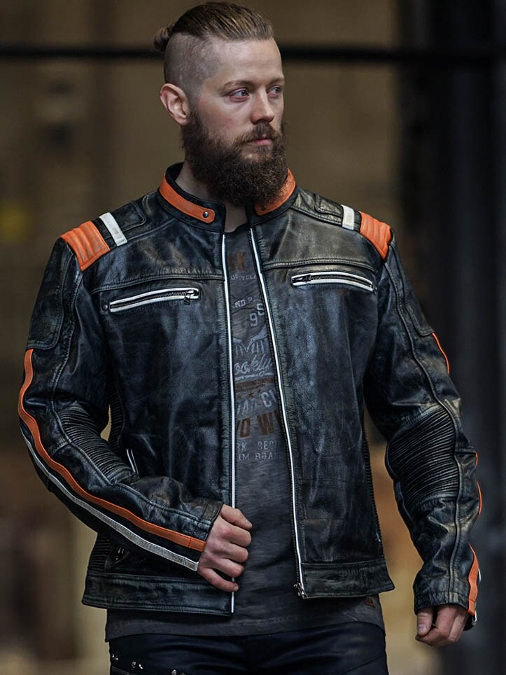 Jakke i vintage-look med striber og detaljer i hvidt og orange. Den har fire lukkede forlommer, to inderlommer og en lav krave. Denne unikke læderjakke er fremstillet i kvalitetslæder og designet af Rockdenim med inspiration fra motorsporten.