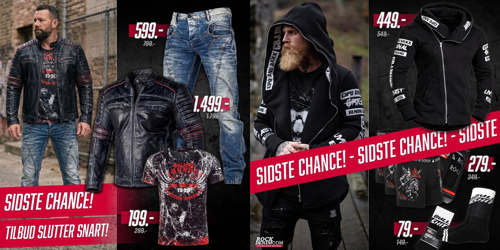 Her har vi samlet de bedste tilbud fra RockDenim – både vores nyeste kampagner og Facebook-indlæg for dem, der ikke bruger sociale medier. Hold dig opdateret og gå ikke glip af de fedeste deals på jeans, jakker og rockinspireret herretøj.