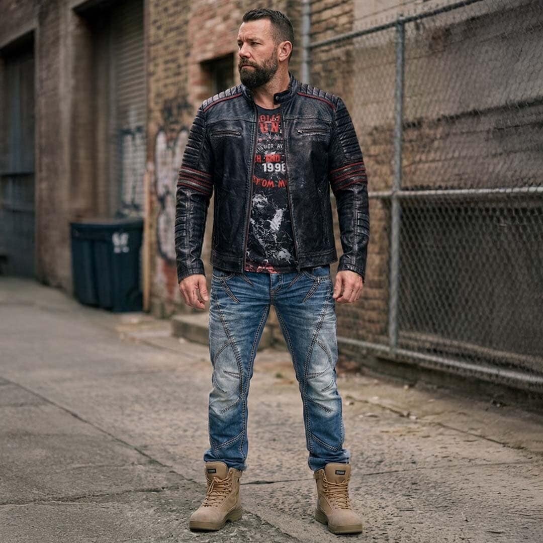 Dette outfit forener det bedste fra klassisk motorcykelstil med moderne detaljer. Det er tøj til manden, der tør vise sin karakter gennem sin stil.