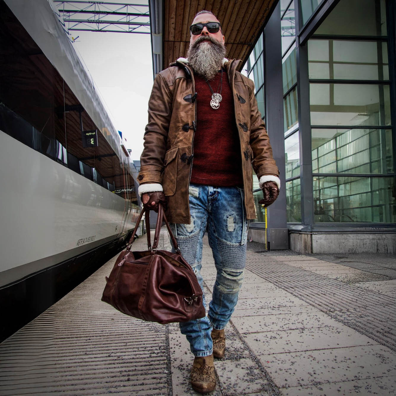 Skapa en kraftfull och tidlös stil med den bruna fodrade skinnkappan RD Matan. Denna robusta kappa ger en rustik känsla som perfekt matchas med ett par slitna jeans och en varmstickad tröja. Outfiten fulländas av den rymliga och stilrena läderväskan RD Mohawk Leather Duffel, idealisk för både weekendresor och vardagens äventyr.